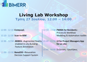 H κοινοπραξία του έργου ΒΙΜERR σε συνεργασία με το ΕΚΕΤΑ/ ΙΠΤΗΛ, διοργανώνει την Τρίτη 27 Ιουλίου 2021, Βιωματικό Εργαστήριο (Living Lab Workshop) για την παρουσίαση των εργαλείων του BIMERR σε αντίστοιχους φορείς, επαγγελματίες και επιχειρήσεις του ευρύτερου κατασκευαστικού κλάδου….